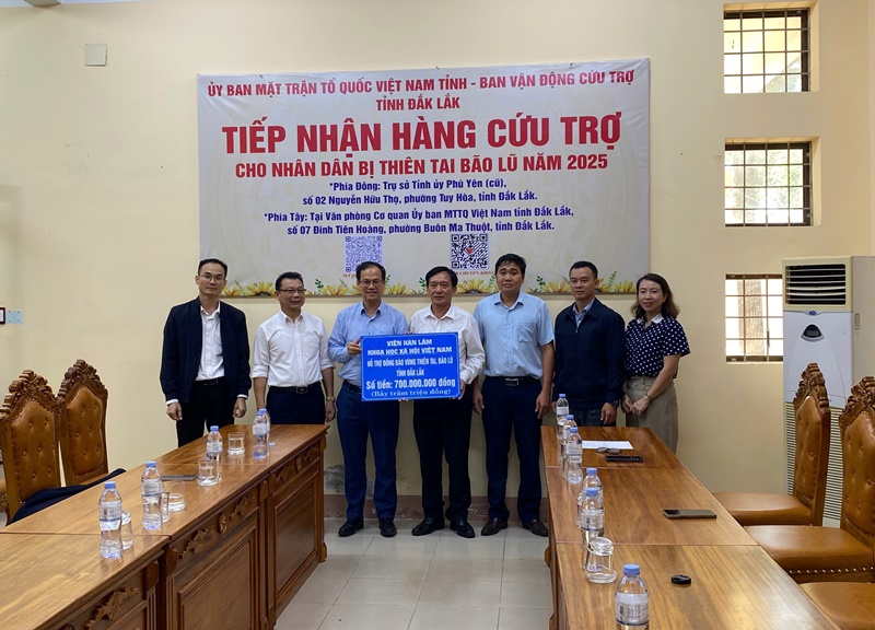 Sáng ngày 5/12/2025 tại trụ sở của Ủy ban mặt trận tổ quốc Việt Nam tỉnh Đắk Lắk. Đại diện lãnh đạo viện Hàn lâm khoa học xã hội Việt Nam, đồng chí TS. Đỗ Xuân Lân, Phó Bí thư chuyên trách công tác Đảng, Chủ nhiệm UB kiểm tra Đảng của Viện Hàn lâm cùng với TS. Nguyễn Duy Thụy Viện trưởng viện Khoa học xã hội vùng Trung Bộ và Tây Nguyên và đoàn công tác đến trao tổng số tiền là 700.000.000 đ (bảy trăm triệu đồng) cho đại diện ban vận động cứu trợ tỉnh Đắk Lắk, mà toàn thể tấm lòng của viên chức và người lao động của toàn viện Hàn lâm Khoa học xã hội Viện Nam đã quyên góp được để ủng hộ, giúp đỡ cho đồng bào bị thiệt hại do bão, lũ, lụt trong thời gian qua của phía đông tỉnh Đắk Lắk.